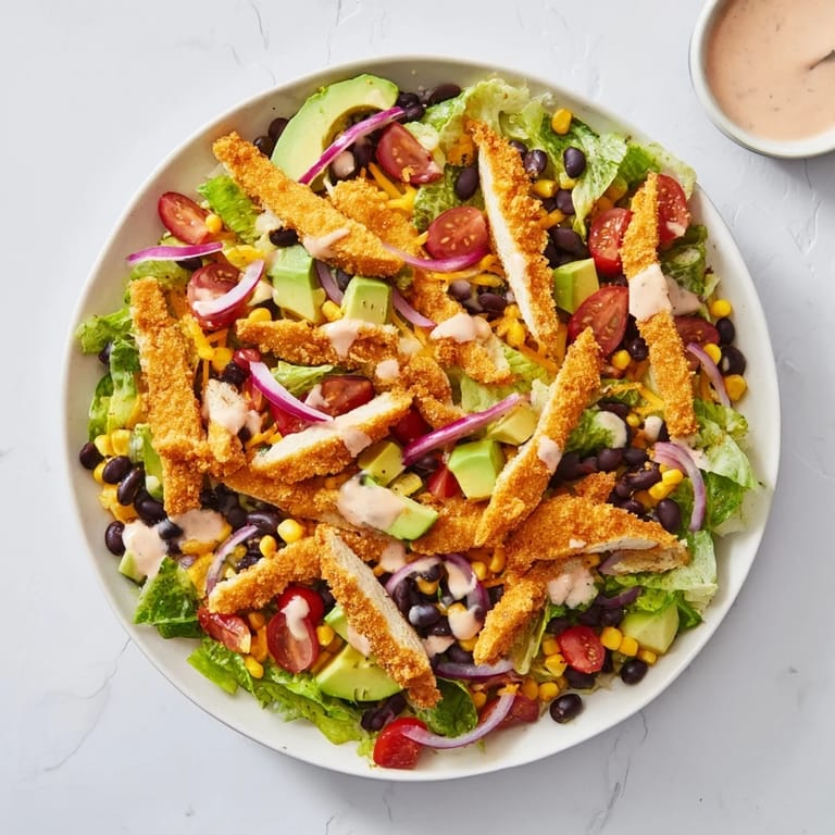 - Place the crispy chicken strips on top, scatter the tortilla strips over everything, and drizzle with the salsa ranch dressing just before serving. This keeps the salad from getting soggy and lets everyone enjoy the textures at their peak.