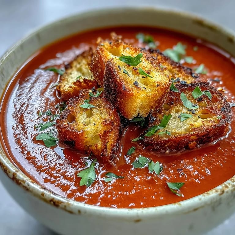 Pin It There's a particular Saturday afternoon I can't shake from memory—the kind where the kitchen fills with smoke in the best way possible, and you realize you're making something genuinely special. I'd bought those red peppers on impulse at the farmer's market, charred them in the oven, and suddenly had this silky, vibrant soup that tasted like summer distilled into a bowl. The harissa added this warm, slightly smoky kick that made it feel exotic without being fussy, and topping it with homemade croutons turned a simple lunch into something you'd actually want to serve guests.