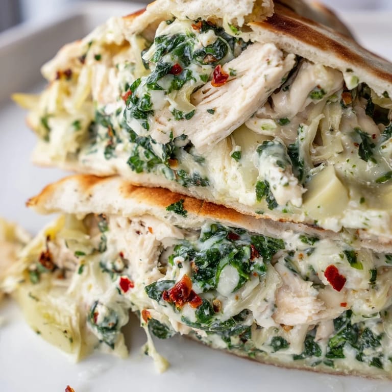 Pin It The smell of spinach artichoke dip always takes me back to my friend Sarah's apartment, where we'd crowd around her coffee table with torn baguette pieces. One rainy Tuesday, I had leftover rotisserie chicken and those same dip ingredients staring at me from the fridge. Why not stuff that glorious mixture into pita pockets instead? The first bite was messy, creamy, and absolutely perfect—like someone took the best appetizer ever and made it into actual dinner.